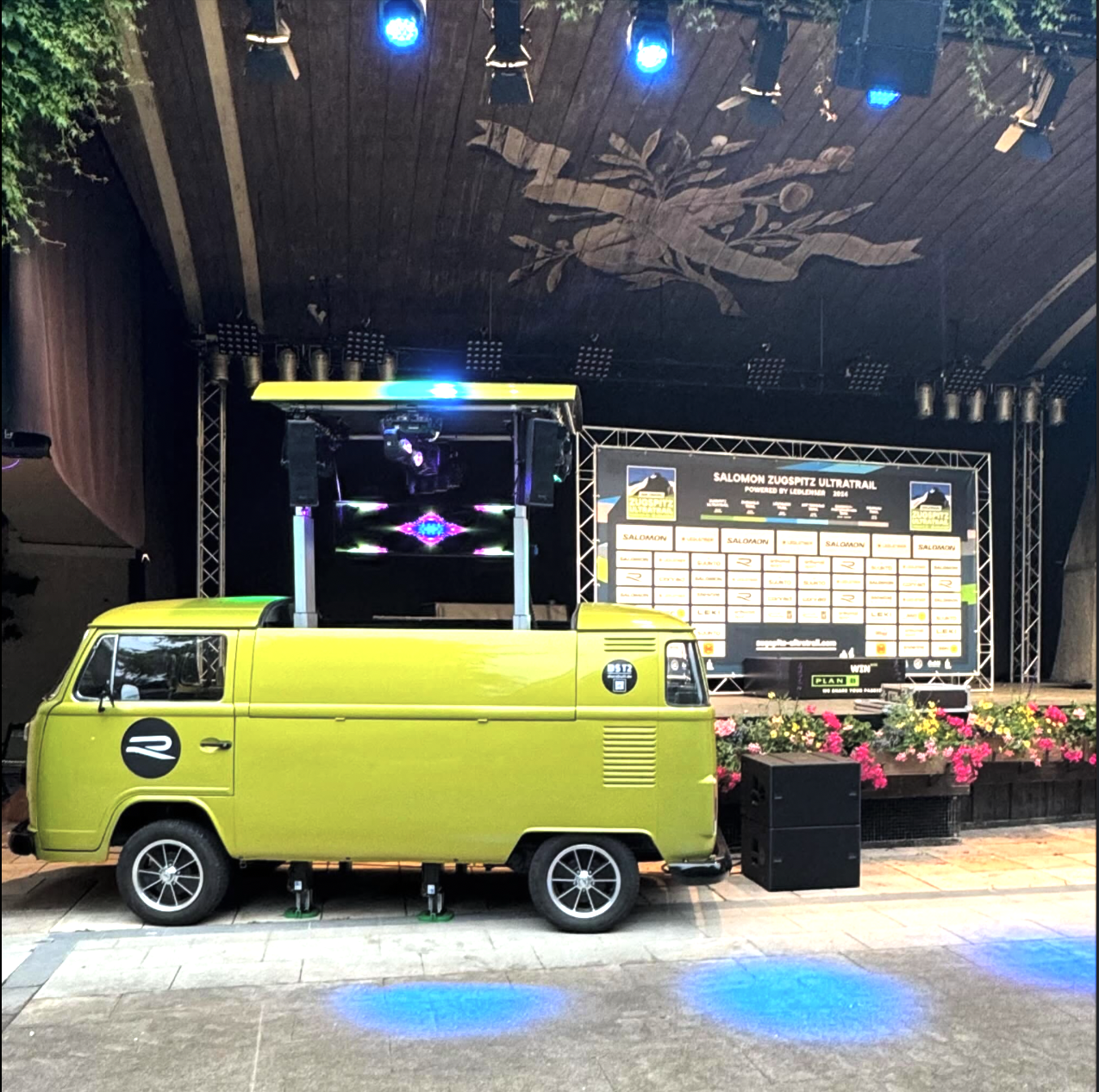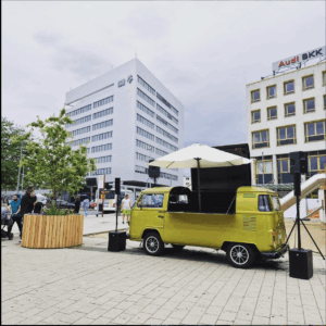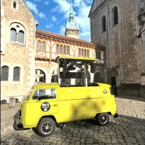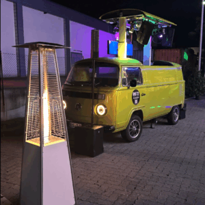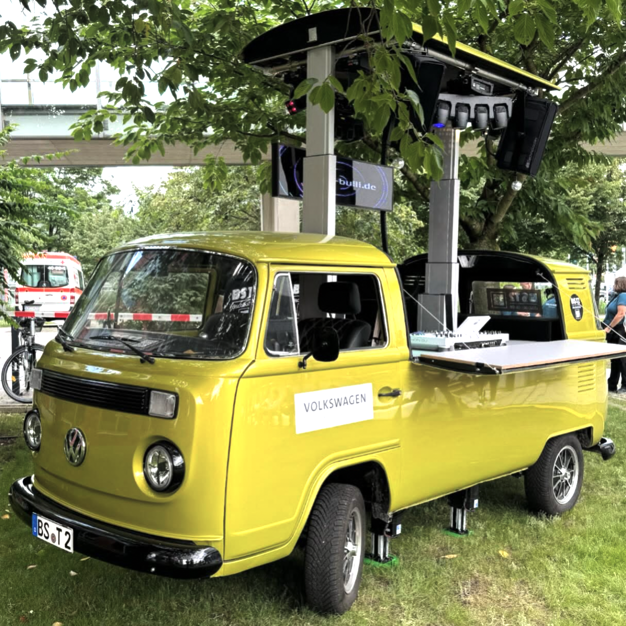 In Ausnahmefällen ja – sofern genügend Platz und Zufahrt besteht. Ideal eignet sich der Bulli aber für Outdoor-Events, Innenhöfe oder überdachte Flächen.